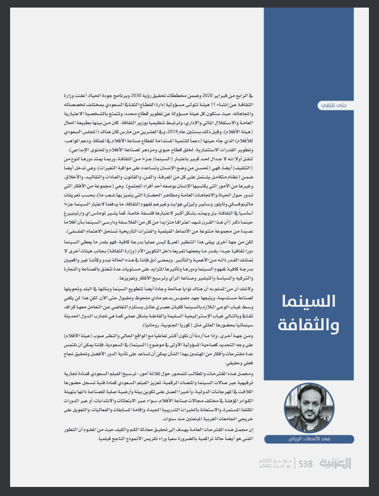 *نشر في مجلة ( المجلة العربية ) عدد 537 في الرابع من فبراير 2020 وضمن مخططات تحقيق رؤية 2030 وبرنامج جودة الحياة تعلن وزارة الثقافة عن إنشاء 11 هيئة تتولىمسؤولية إدارة القطاع الثقافي السعودي بمختلف تخصصاته واتجاهاته، حيث ستكون…